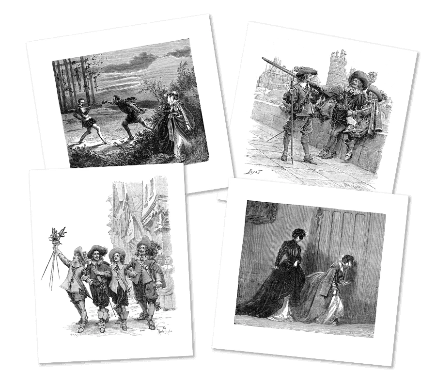 En el siglo XIX, Francia experimentó un auge en el grabado, relacionado con la ilustración de libros, revistas y periódicos. G. Doré, M. Leloir, J. Désandré, A. de Neuville, T. Johannot, G. Janet, Daubigny, Janet-Lange y F. Philippoteaux son algunos artistas que, a través de sus dibujos, dieron vida al texto y a los personajes míticos de Alejandro Dumas.