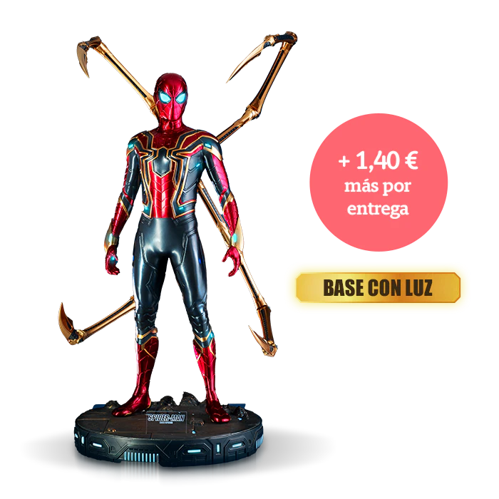 La base muestra a Spider-Man en todo su esplendor, con las patas mecánicas de su traje de Iron Spider. Incluye un control remoto para activar los efectos de iluminación LED, y la placa transparente con el nombre de tu Súper-Héroe favorito.