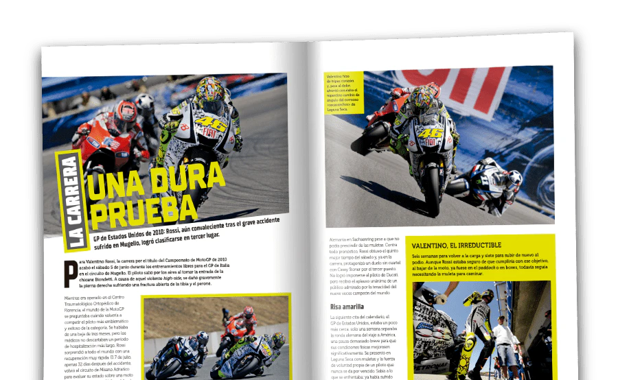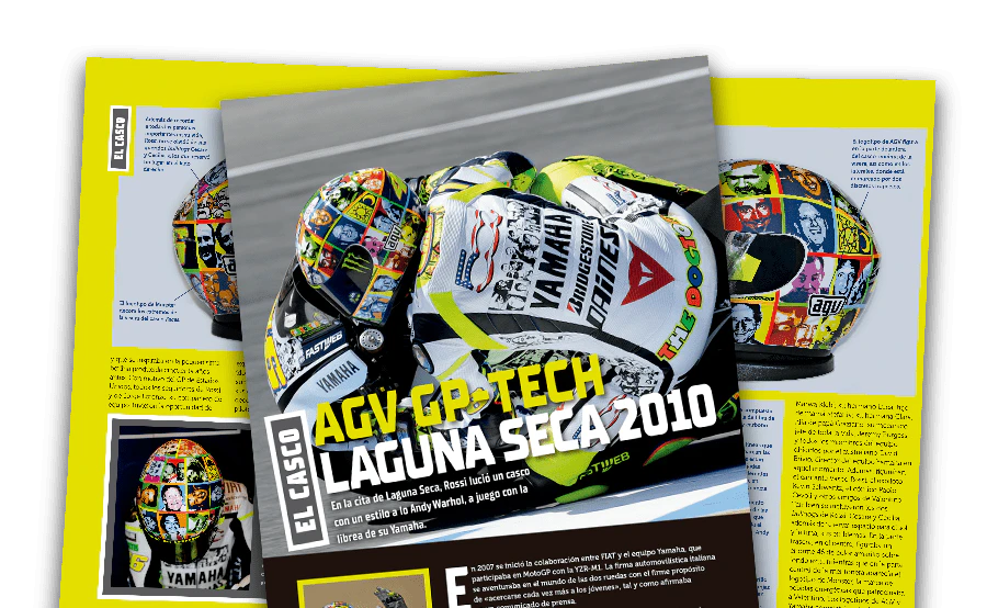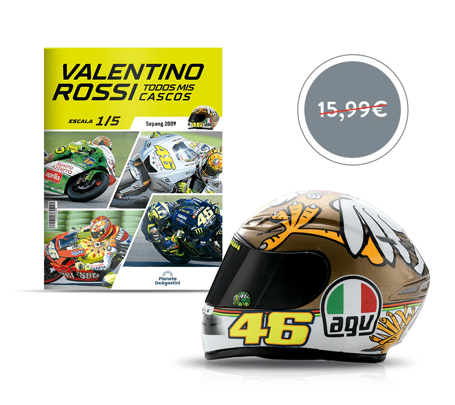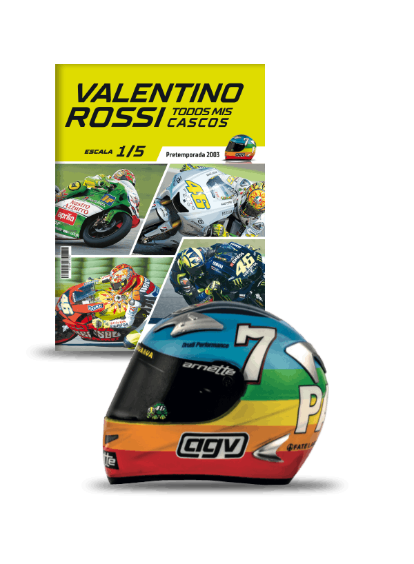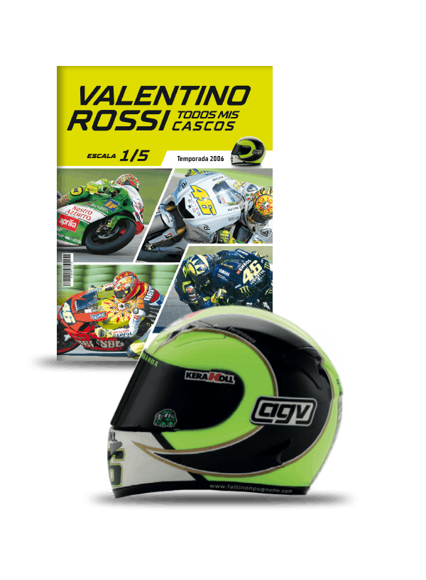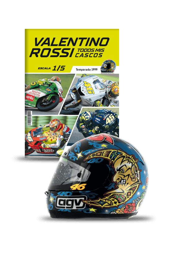 Una réplica fiel de uno de los cascos que lució Valentino Rossi en una de sus emocionantes temporadas de motociclismo. Un fascículo repleto de información, fotos, anécdotas y detalles curiosos sobre el campeón italiano, su increíble carrera, los grandes circuitos, las motos, el equipo y mucho más.