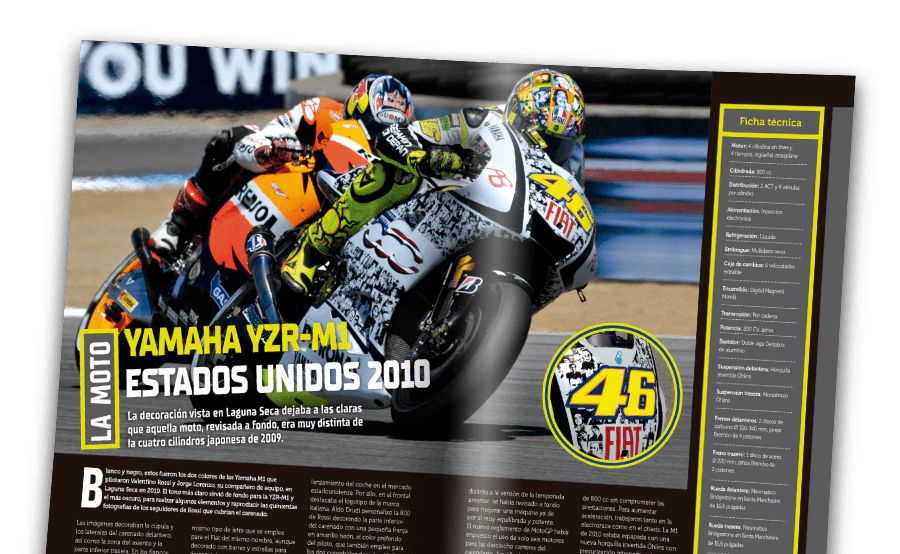 La decoración vista en Laguna Seca dejaba a las claras que aquella moto, revisada a fondo, era muy distinta de LA MOTO la cuatro cilindros japonesa de 2009. Blanco y negro, estos fueron los dos colores de las Yamaha M1 que pilotaron Valentino Rossi y Jorge Lorenzo, su compañero de equipo, en Laguna Seca en 2010. El tono más claro sirvió de fondo para la YZR-M1 y el más oscuro, para realzar algunos elementos y reproducir las quinientas fotografías de los seguidores de Rossi que cubrían el carenado.