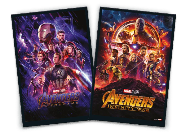 Dos pósters a todo color con carteles de películas Marvel.