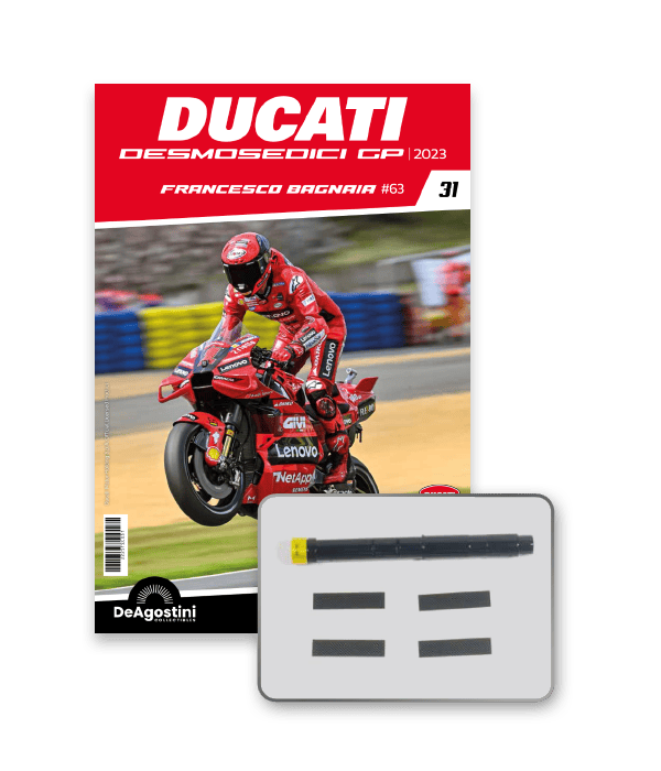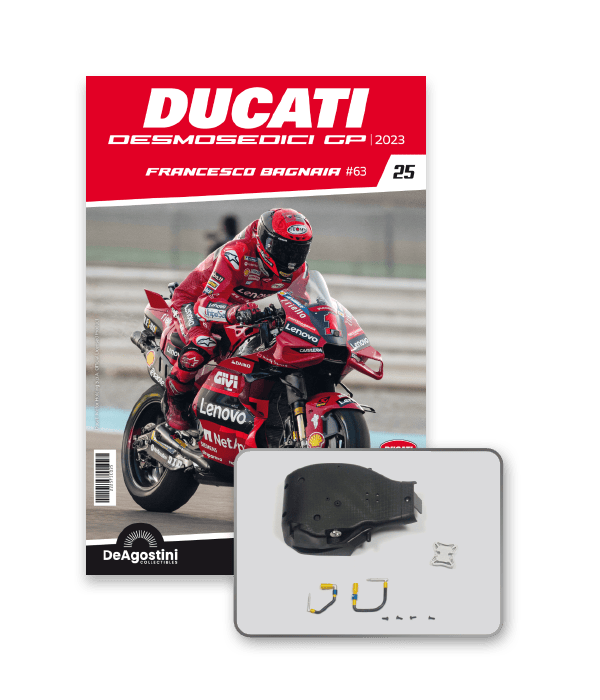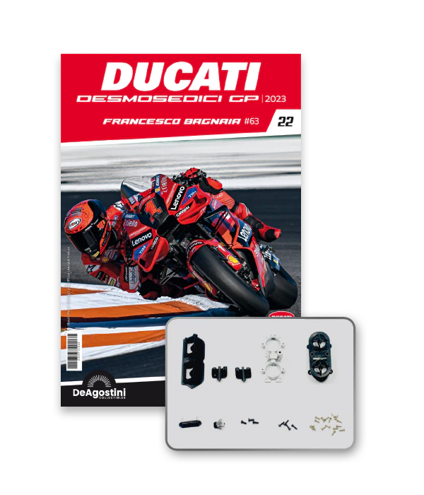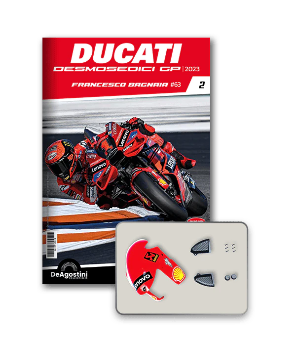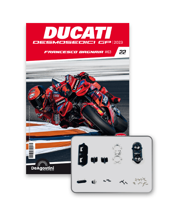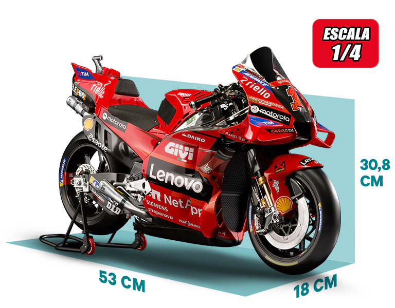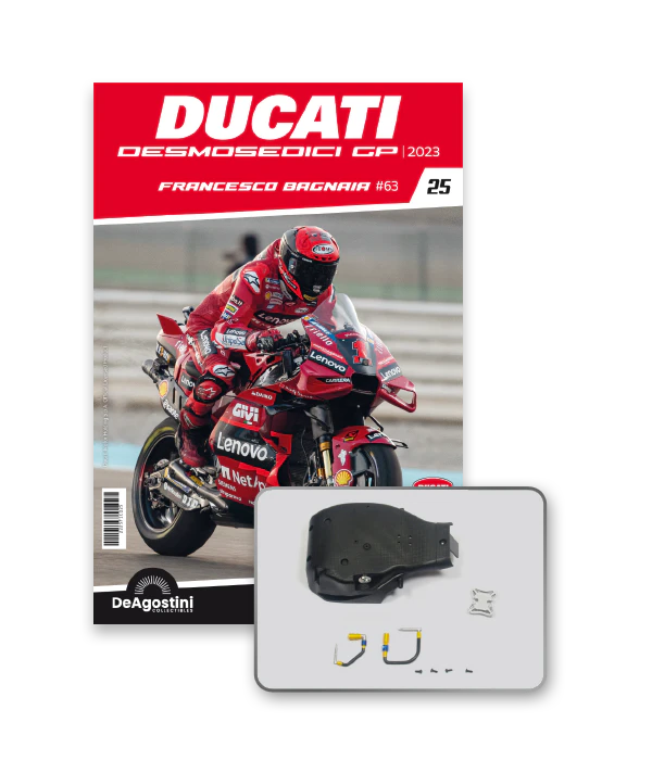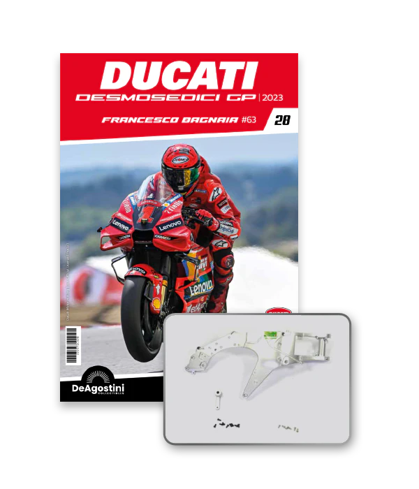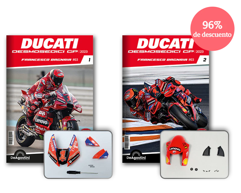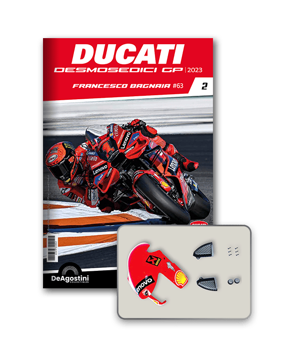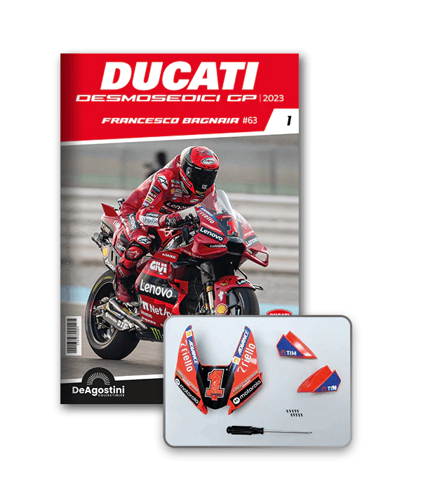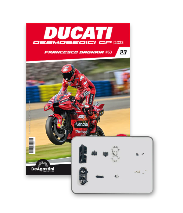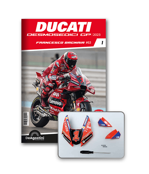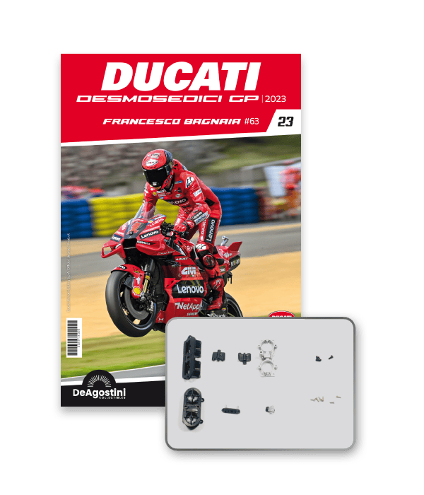 Construye la moto Campeona del Mundo: ¡una exclusiva y fiel réplica a escala 1/4 de la legendaria DUCATI DESMOSEDICI GP23 de FRANCESCO BAGNAIA! La moto que confirmó la maestría tecnológica de un motor V4 de gran potencia: la máquina que evolucionó la GP22 para repetir el dominio en los circuitos y despertó, además, emociones inolvidables. El inicio del reinado Ducati en el Motociclismo, que a día de hoy disfrutamos.