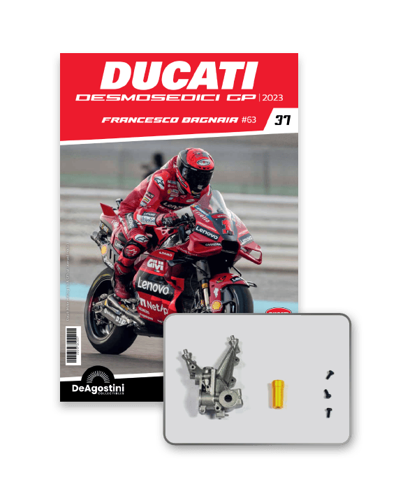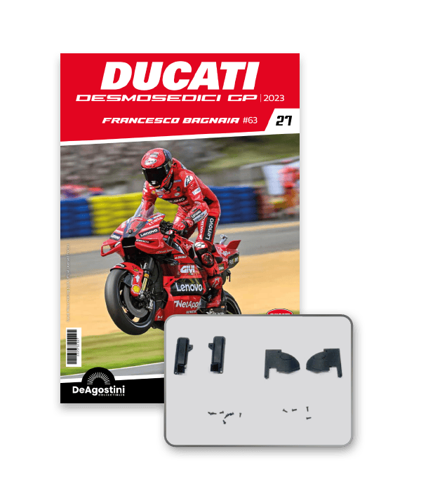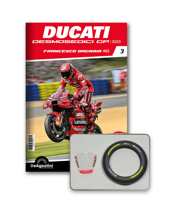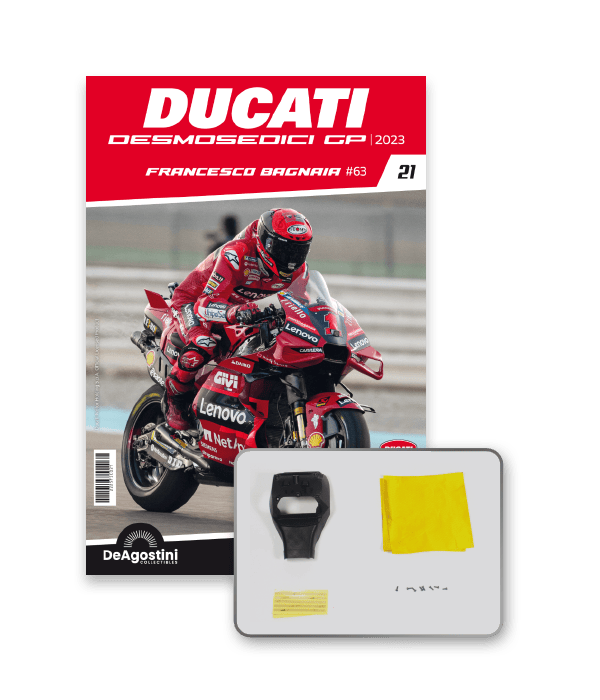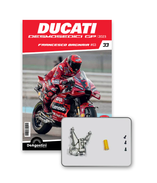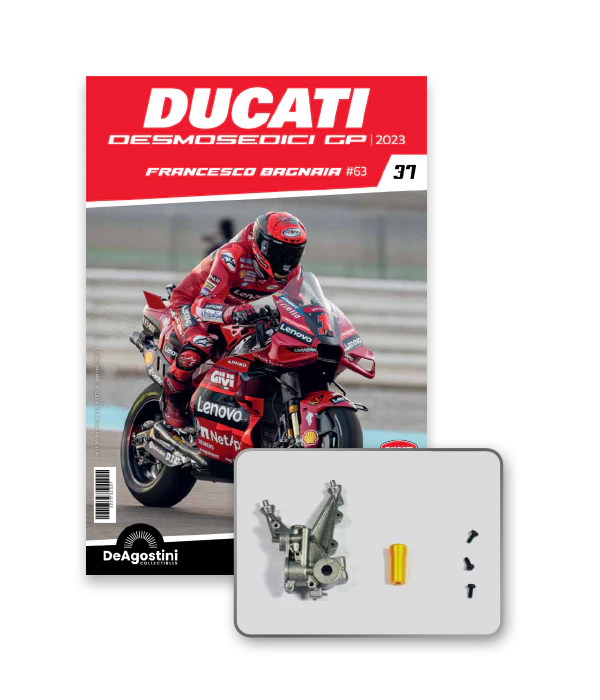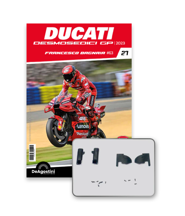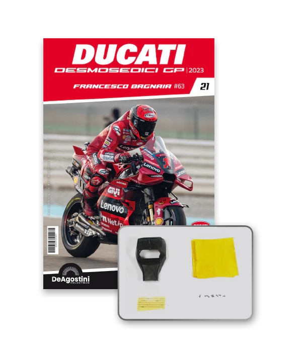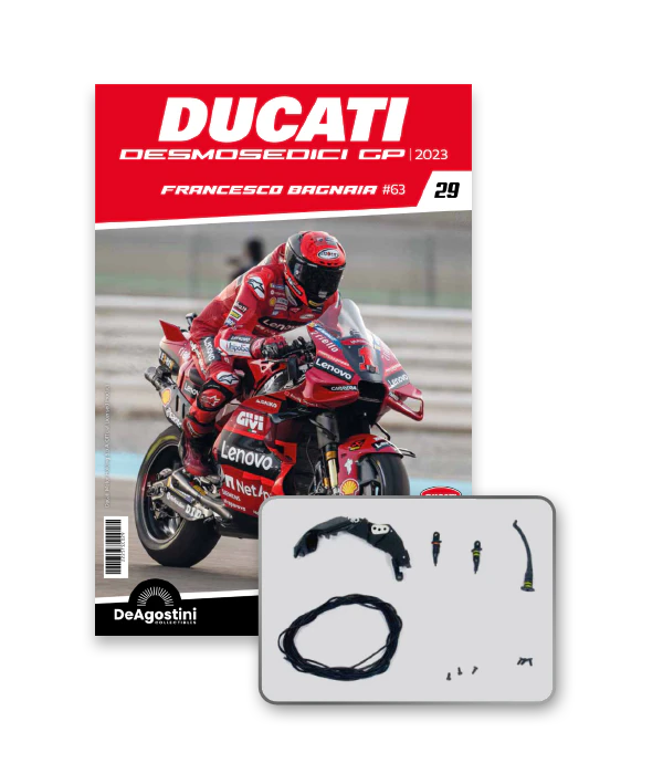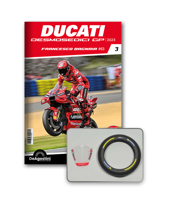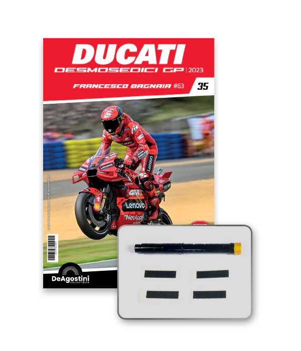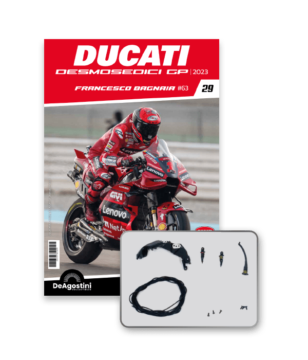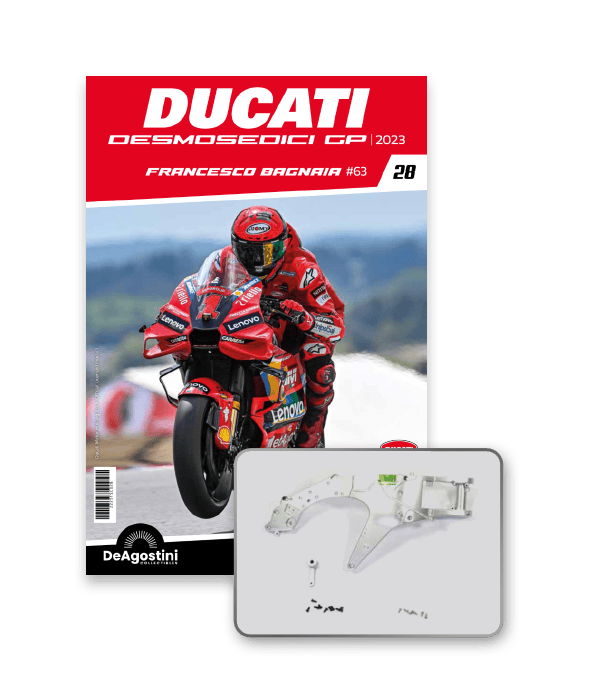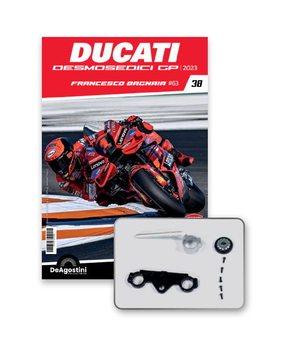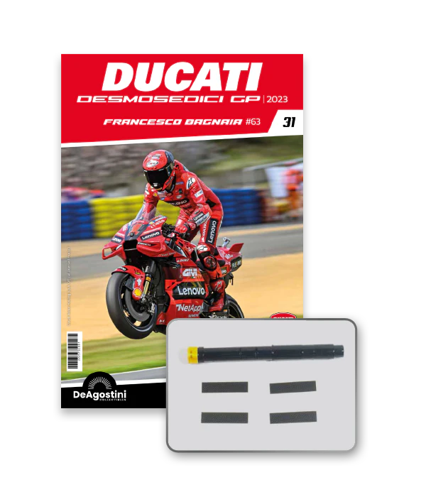 Construye la moto Campeona del Mundo: ¡una exclusiva y fiel réplica a escala 1/4 de la legendaria DUCATI DESMOSEDICI GP23 de FRANCESCO BAGNAIA! La moto que confirmó la maestría tecnológica de un motor V4 de gran potencia: la máquina que evolucionó la GP22 para repetir el dominio en los circuitos y despertó, además, emociones inolvidables. El inicio del reinado Ducati en el Motociclismo, que a día de hoy disfrutamos.