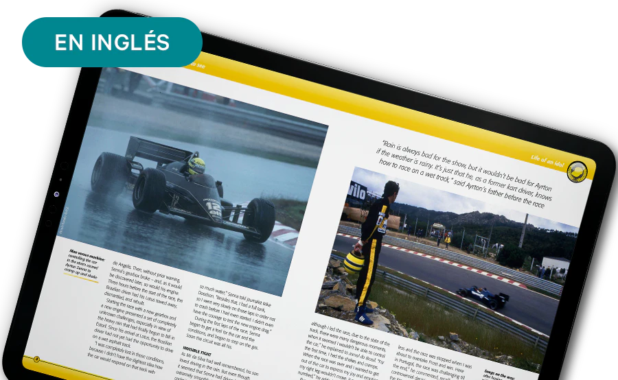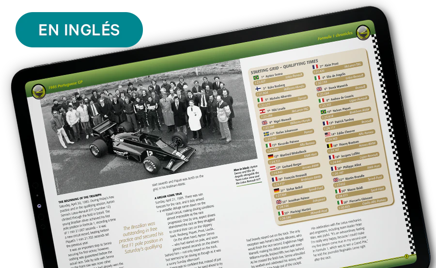 Ayrton Senna consiguió su primera victoria en la Fórmula 1 en el circuito de Estoril (Portugal) el 21 de abril de 1985, pilotando un Lotus 97T con motor Renault EF4B. Su monoplaza llevaba el número 12 en color dorado. Ese día, Ayrton Senna entró en el Olimpo de los grandes campeones. Había nacido el mito.