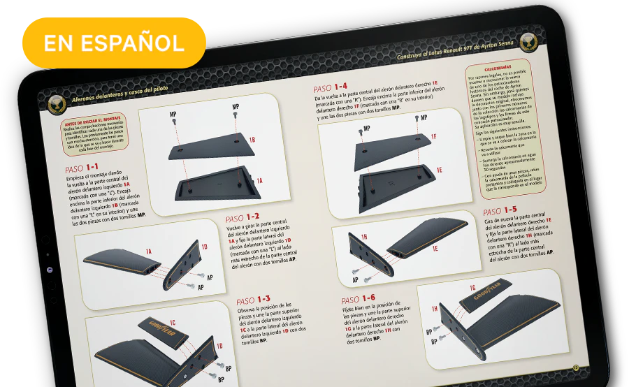 Cada una de las entregas va acompañada de explicaciones detalladas, diagramas, fotos y asesoramiento técnico para que pueda montar paso a paso y fácilmente las piezas del sensacional Lotus Renault 97T de Ayrton Senna.