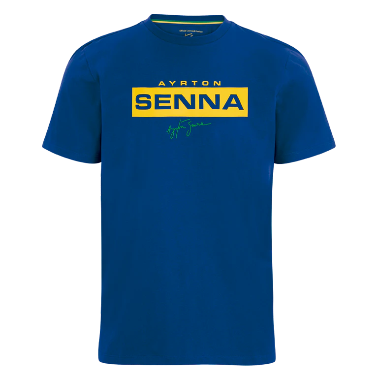 Ya sea en los circuitos o en la calle luce esta colorida camiseta de Ayrton Senna con licencia oficial.