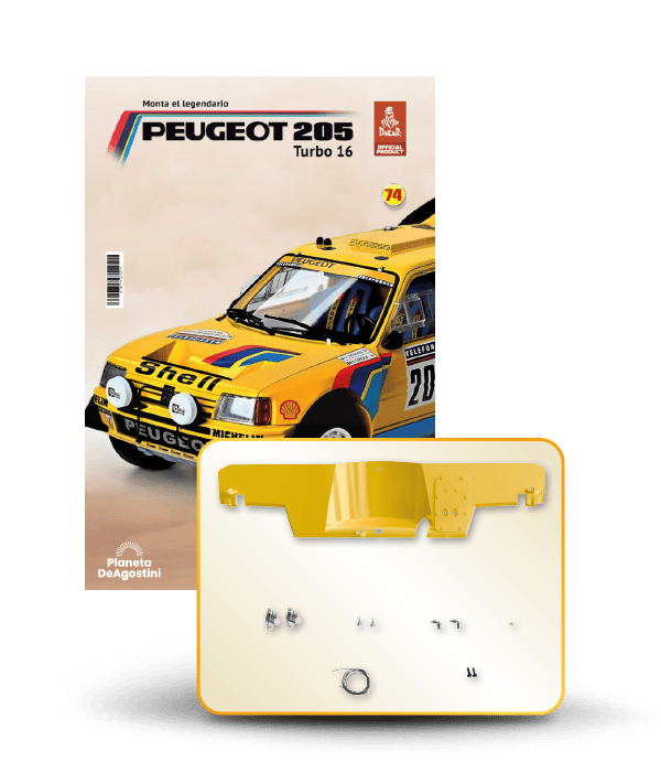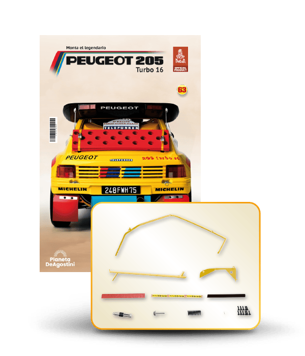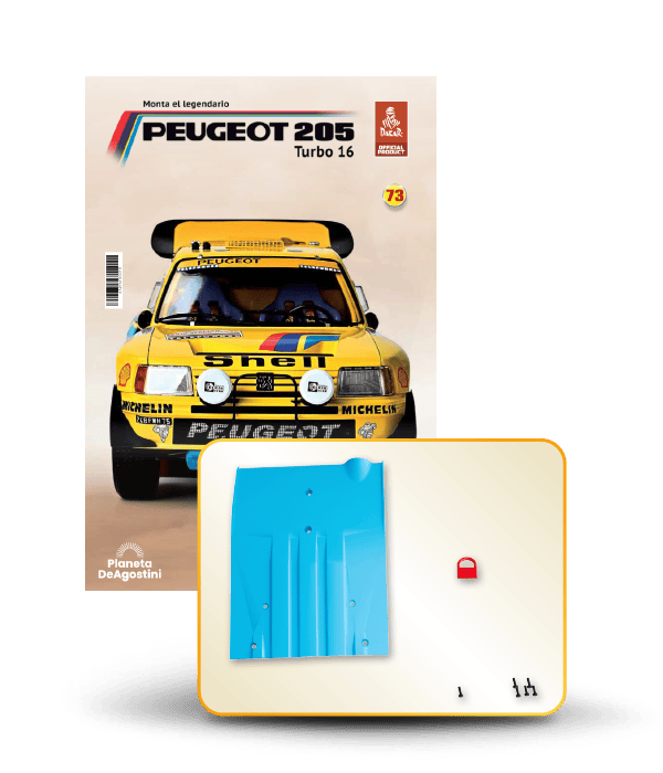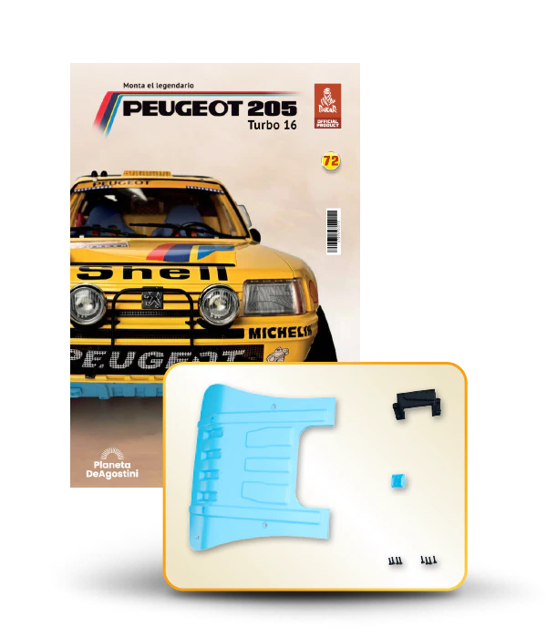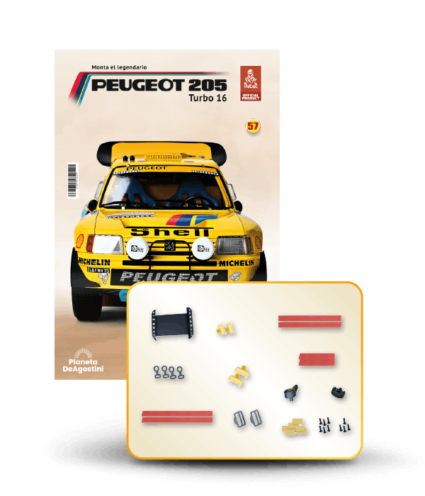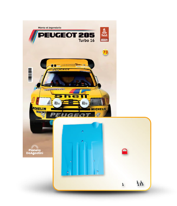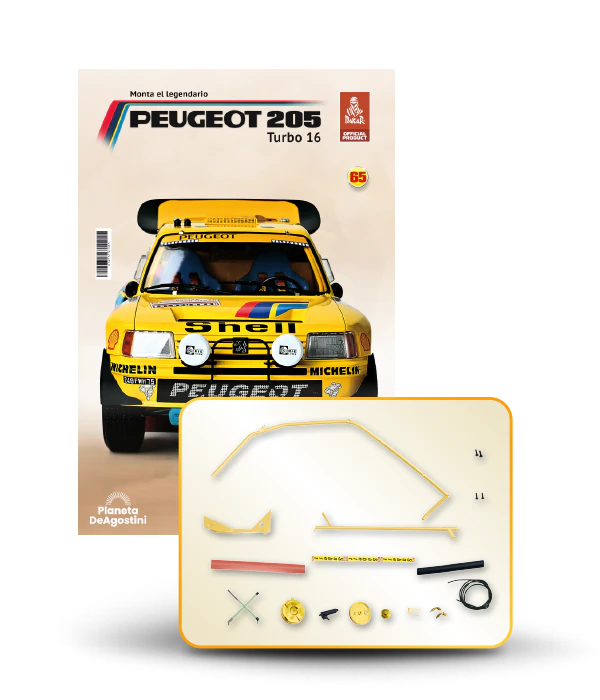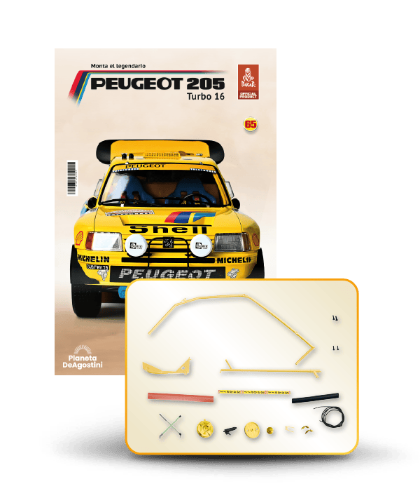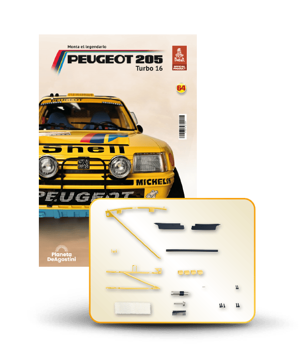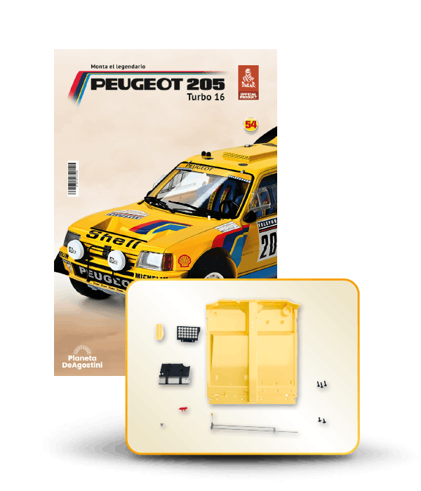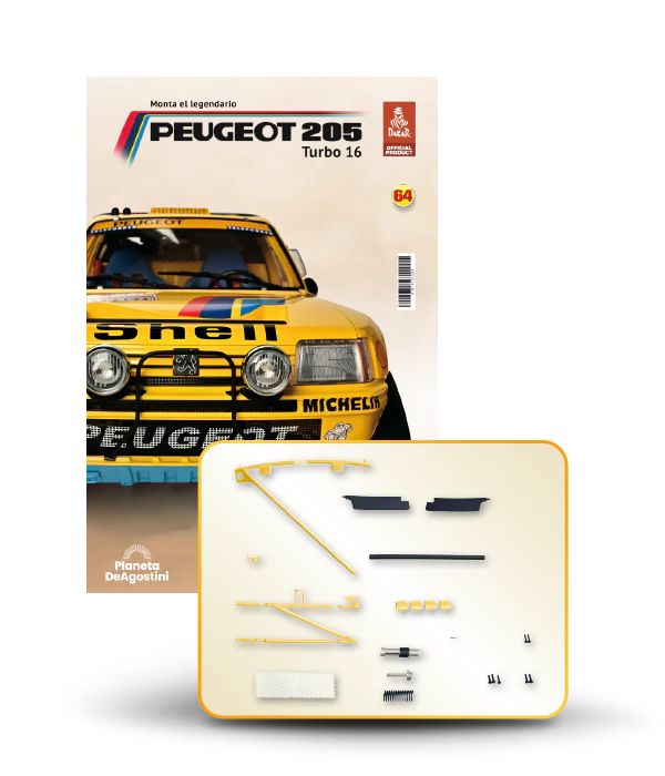 Ahora puedes construir tu propio modelo a escala 1/8 del espectacular Peugeot 205 Turbo 16 Grand Raid. Esta réplica inédita es una prestigiosa incorporación al mundo del modelismo. Diviértete montándola y exponiéndola en un lugar destacado de tu casa.